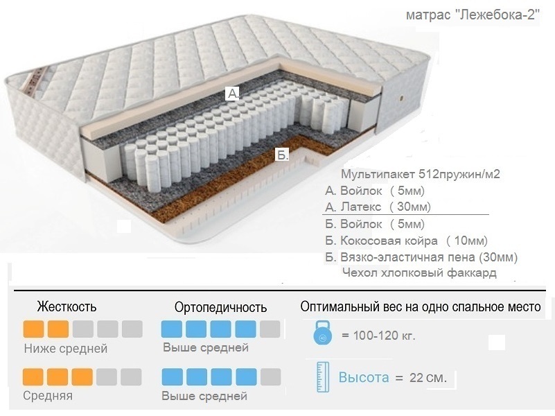 Основа матраса - блок независимых пружин (мультипакет). Изолирующая прослойка из термовойлока исключает соприкосновение пружинного блока с другими наполнителями. Каждая сторона матраса включает два слоя: первый - слой кокосовой койры, который обеспечивает умеренную жёсткость, оптимальный ортопедический эффект, надежную поддержку позвоночника. Второй слой - смягчающий "пена эластичная 30мм), она идеально повторяет контуры человеческого тела, поглощает вибрации от движения, обеспечивая максимальный комфорт, придаёт упругость, он имеет высокие восстанавливающие свойства, моментально принимая первоначальную форму. Открытая сотовая структура в сочетании с системой отверстий позволяет матрасу дышать, тем самым уменьшая накопление тепла. В качестве обивочного материала используется светлый хлопковый жаккард, простёганный на холофайбере. Матрас умеренной жёсткости. Высота матраса 22 см. Максимальный вес на спальное место 120 кг.