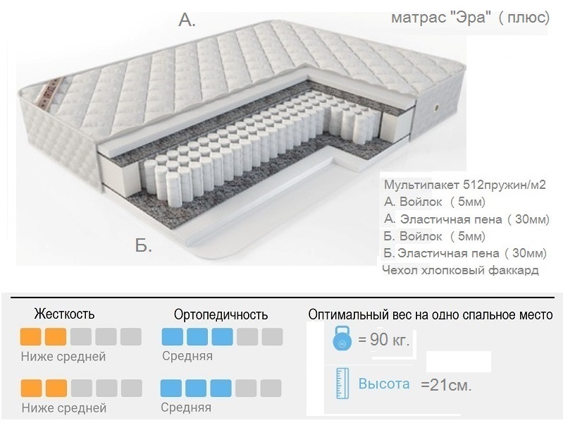 Матрас на основе блока независимых пружин (мультипакет), который легко адаптируется к формам Вашего тела. Сжатие каждой отдельной пружины в блоке происходит независимо от соседних пружин, поэтому отсутствует эффект «волны». Прослойка из термовойлока изолирует пружинный блок от мягких наполнителей. В качестве мягкого наполнителя используется материал "вязко-эластичная пена (ВЕП)", Матрас средней жёсткости. Высота матраса 21 см. Максимальный вес на спальное место 100 кг.