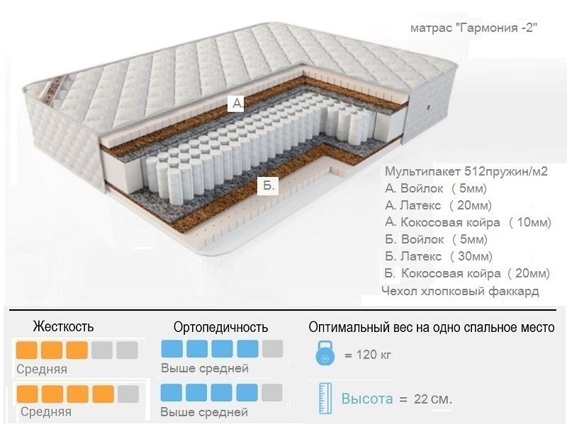 Основа матраса - блок независимых пружин (мультипакет). Изолирующая прослойка из термовойлока исключает соприкосновение пружинного блока с другими наполнителями. Каждая сторона матраса включает два слоя: первый - слой кокосовой койры, который обеспечивает умеренную жёсткость, оптимальный ортопедический эффект, надежную поддержку позвоночника. Второй слой - смягчающий наполнитель натуральный латекс (20/30мм), он идеально повторяет контуры человеческого тела, поглощает вибрации от движения, обеспечивая максимальный комфорт, придаёт упругость, он имеет высокие восстанавливающие свойства, моментально принимая первоначальную форму. Открытая сотовая структура в сочетании с системой отверстий позволяет матрасу дышать, тем самым уменьшая накопление тепла. В качестве обивочного материала используется светлый хлопковый жаккард, простёганный на холофайбере. Матрас умеренной жёсткости. Высота матраса 25 см. Максимальный вес на спальное место 120 кг.