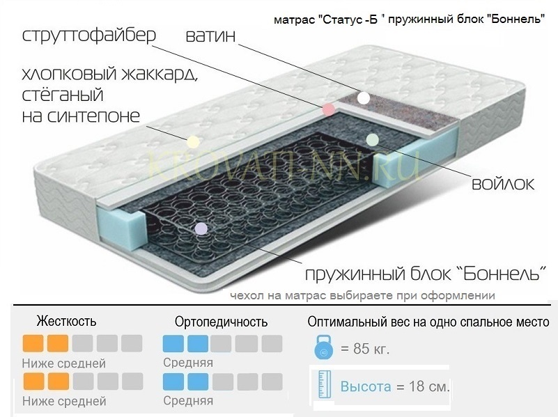 Пружинный блок "боннель" распределяет нагрузку равномерно, без резких проваливаний, данный пружинный блок обеспечивает комфортные условия для сна.